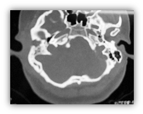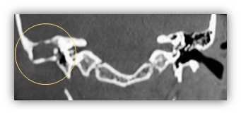 Imagen 3: TC simple de oídos, corte coronal; se observa ocupación de epi-meso-hipotímpano por lesión isodensa a tejidos blandos.