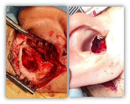 En este caso, el diagnóstico de colesteatoma se realizó a los 18 años, por la presentación de una fístula retroauricular. Quien se interviene para su tratamiento quirúrgico, realizándose meatoconchoplastia y mastoidectomia en oído derecho (Imagen 4).