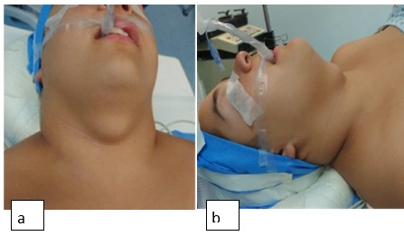 Figura 1. a y b: observe masa en línea media el cuello en región infrahiodea con bordes regulares.