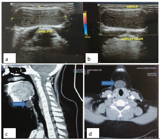 Figura 2 a y b: Ultrasonido de cuello: observe imagen hipoecoica con cápsula no vascularizada al doppler. C y d: Tomografía de cuello en la cual se observa imagen isodensa a tejidos blandos localizada en región infrahiodea en la línea media (flechas azules)