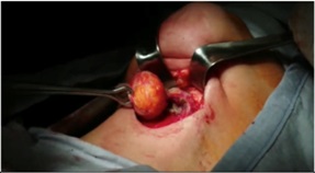 Figura 3. Resección de la tumoración con íntima relación con el cuerpo del hueso hioides (previa escisión del mismo)