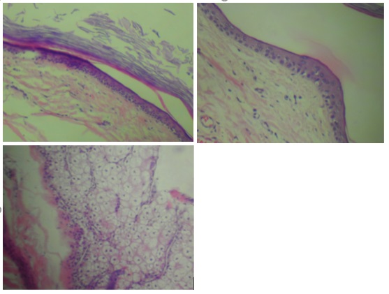 Se decide la intervención quirúrgica con técnica de Sistrunk bajo anestesia general con escisión completa de la tumoración (figura 3). El reporte histopatológico macroscópico reportó tumoración nodular con la presencia de fragmentos fusiforme con una consistencia blanda. Al corte es quístico y unilocular, con un contenido sebáceo y color blanco-grisáceo ligeramente corrugada. A la microscopía electrónica los cortes histopatológicos muestran varios grupos de glándulas reactivas dispuestas en grupos confluentes, circundadas por un estroma fibromuscular del mismo perfil, en el que se disponen cúmulos dispersos de células de inflamación mixta y algunos histiocitos de citoplasma multivacuolados asociados. Las glándulas exhiben variabilidad quística, revestidas por una doble capa de células cubicas con núcleos centrales homogéneos con nucléolo inconspicuo en algunas de ellas, sin atipia ni figuras de mitosis en ningún campo. En el reborde exterior de éstas se identifica la presencia de células “mioepiteliales”. No se identifican datos de malignidad, confirmado el diagnóstico de teratoma quístico maduro benigno totalmente extirpado (figura 4. ).